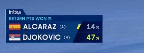 第三盘,前四局双方各自保发比分来到2-2。到了第五局,阿卡主动撕开角度,德约跑动击球出现失误,前者成功破发,3-2。随后双方都成功保住了自己的发球局,5-3。不过,面对移动能力超强的阿尔卡拉斯,德约明显有些力不从心。第9局,双方陷入了拉锯战,最后阿尔卡拉斯终于在第6个破发点完成破发,并以6-3拿下本盘。