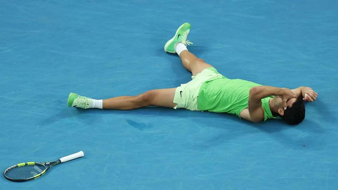 获胜后的阿卡累得摊倒在地上,左手扶着额头,他刚刚经历了5小时27分钟的苦战,这是澳网历史上耗时最长的半决赛,无人知晓在比赛的后半段他的身体遭受了什么。