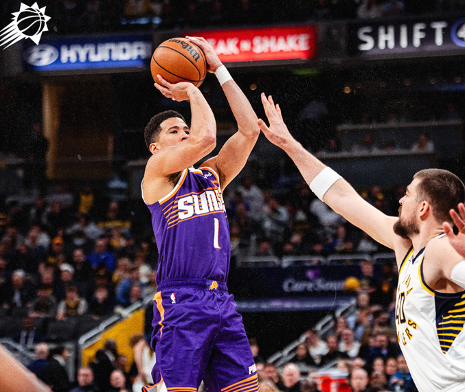 太阳过去3场连赢鹈鹕、黄蜂与雄鹿收获3连胜,步行者过去10场遭遇10连败,本赛季首次交锋太阳主场133-98大胜步行者。本场太阳缺少阿伦、狄龙、马威,步行者缺少哈利伯顿、托平、西亚卡姆与内史密斯。首节开局太阳5-9落后,太阳连得4分追平,太阳随后取得14-11领先。步行者一波9-1攻势反超5分,太阳连得5分追平,双方继续持续交替领先缠斗,布克与内姆哈德展开对攻,首节结束双方维持36-36。首节太阳三分7中4,布克10中6得到15分;步行者三分12中5,内姆哈德5中4得到11分。