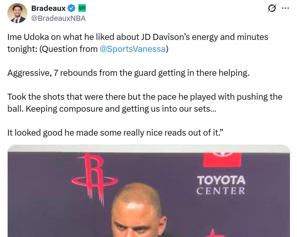 赛后乌度卡点名称赞了戴维森:“他的表现很有侵略性,积极拼抢到7个篮板,频频在内线协防干扰对手,同时进攻端把握住了投篮机会,将推进节奏加快,还能始终保持冷静稳稳组织球队落位,他的临场决策相当出色,整体表现十分亮眼。”